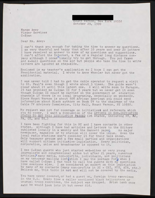 Encloses their teacher's application to get American Presidents material, discusses trying to get C-SPAN 2, and requests coverage of initiative and referendum legislation.
