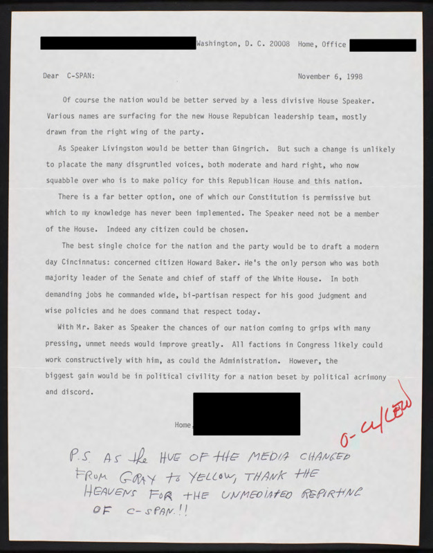 Proposes that a regular citizen be chosen as the Speaker for the House because their recommendation would be bipartisan.