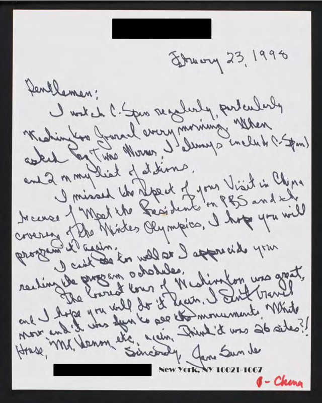 Praises C-SPAN, expresses hope that the program on China will be repeated, thanks C-SPAN for reading program schedules, and lists programs they enjoyed.