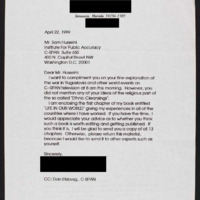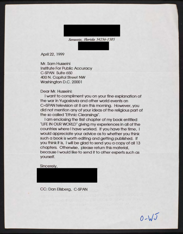 Writes to a C-SPAN guest commending their comments on the war in Yugoslavia, but states they neglected to mention "ethnic cleansings" and asks the guest to review the author's chapter and give their opinion.