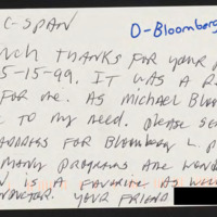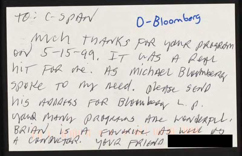 Thanks C-SPAN for a program featuring Michael Bloomberg and asks for his address.