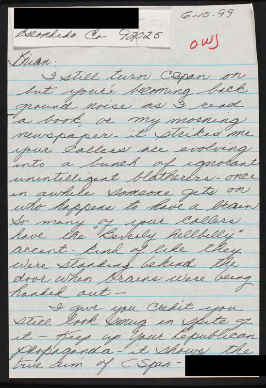 Expresses belief that C-SPAN callers are growing more unintelligent and that C-SPAN perpetuates Republican propaganda.