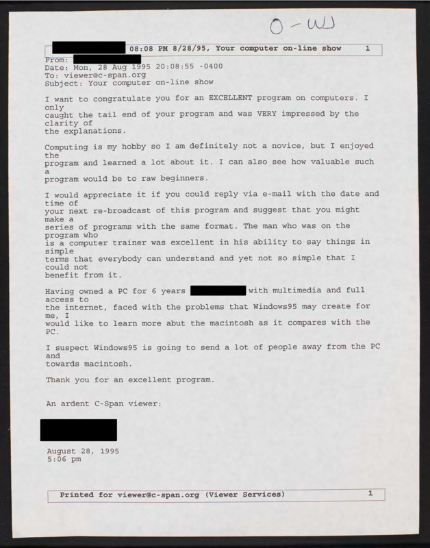 Letter to C-SPAN, 1995-08-28
