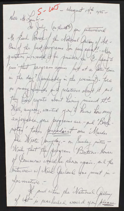 Asks if C-SPAN could rebroadcast a program on the National Gallery of Art and praises Booknotes and other C-SPAN programs.