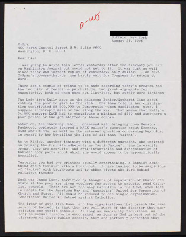 Criticizes two female commentators for alleged sexism, support of abortion, and Catholic education.