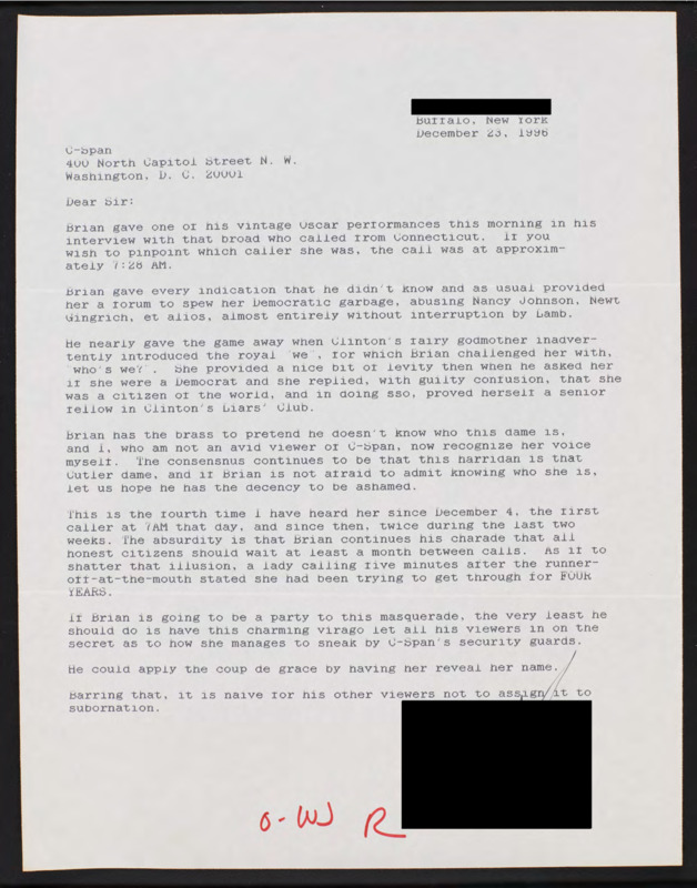 Identifies a woman they feel is calling in too much and thinks Brian Lamb is conspiring to allow her to continue doing so.
