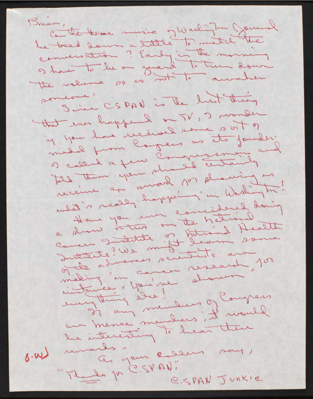 Praises C-SPAN, asks if they could turn down the volume on one of their programs, and asks if they have considered doing a program on cancer research.