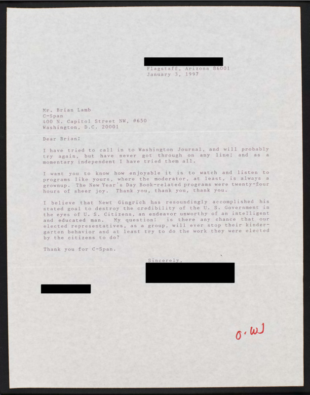 Praises C-SPAN and criticizes Newt Gingrich and other politicians.