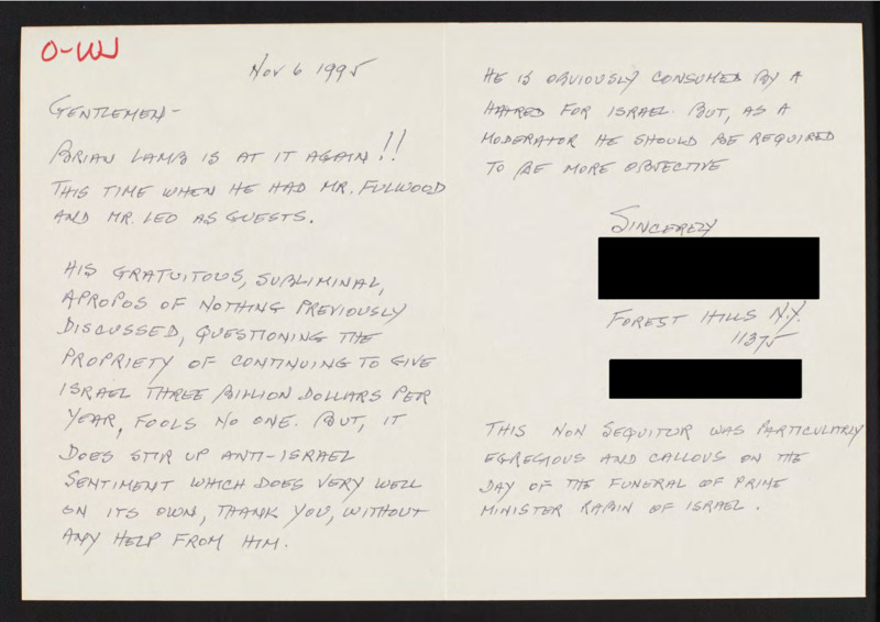 Accuses Brian Lamb of exhibiting hatred of Israel.