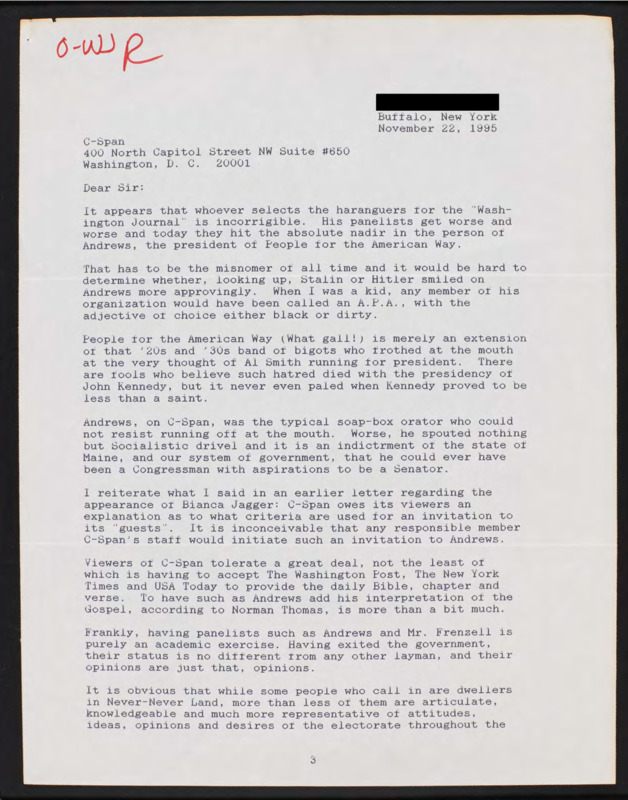Calls the People for the American Way bigoted, reiterates dislike of Bianca Jagger's appearance on C-SPAN, and discusses methods of viewer feedback.