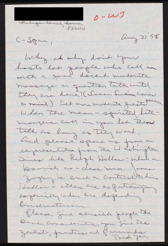 Asks why C-SPAN doesn't let moderate callers talk and criticizes a choice of guest.