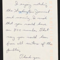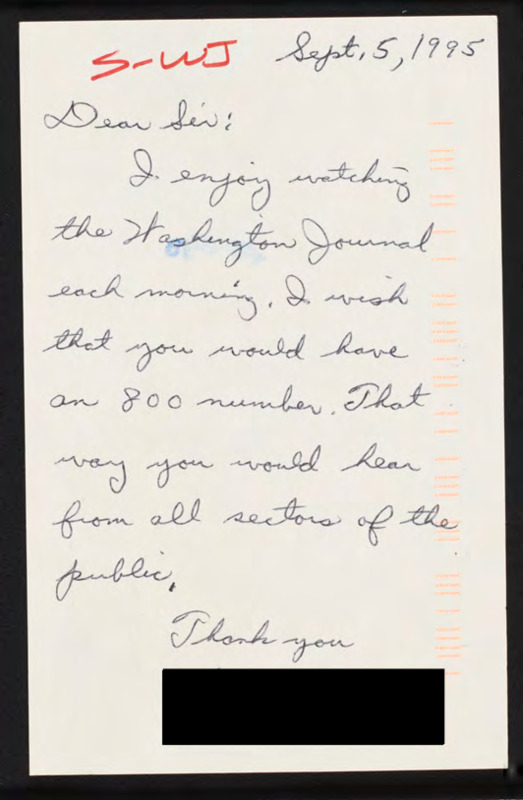 States enjoyment of Washington Journal but wishes they had a toll-free phone number.