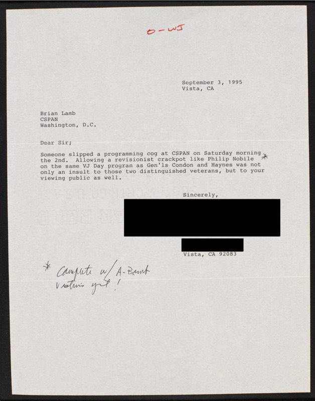 Believes having a particular guest on as part of their V-J Day programming was an insult.