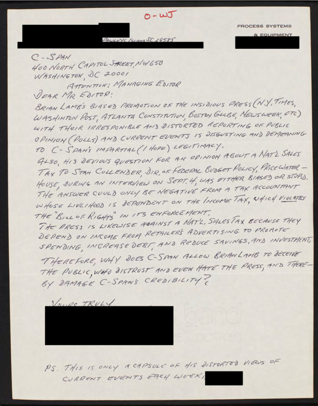 Accuses C-SPAN of bias and cites his promotion of certain newspapers and a comment he made about taxes.
