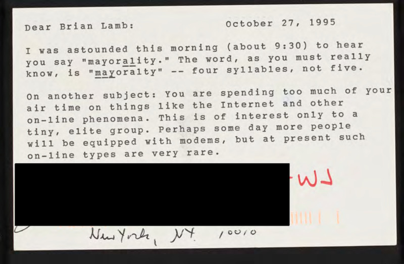 Corrects Brian Lamb's pronunciation of a word and believes coverage of the Internet should be cut back.