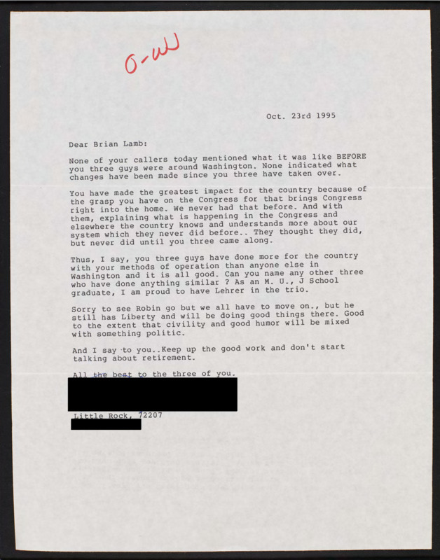 Letter to C-SPAN, 1995-10-18; 97303