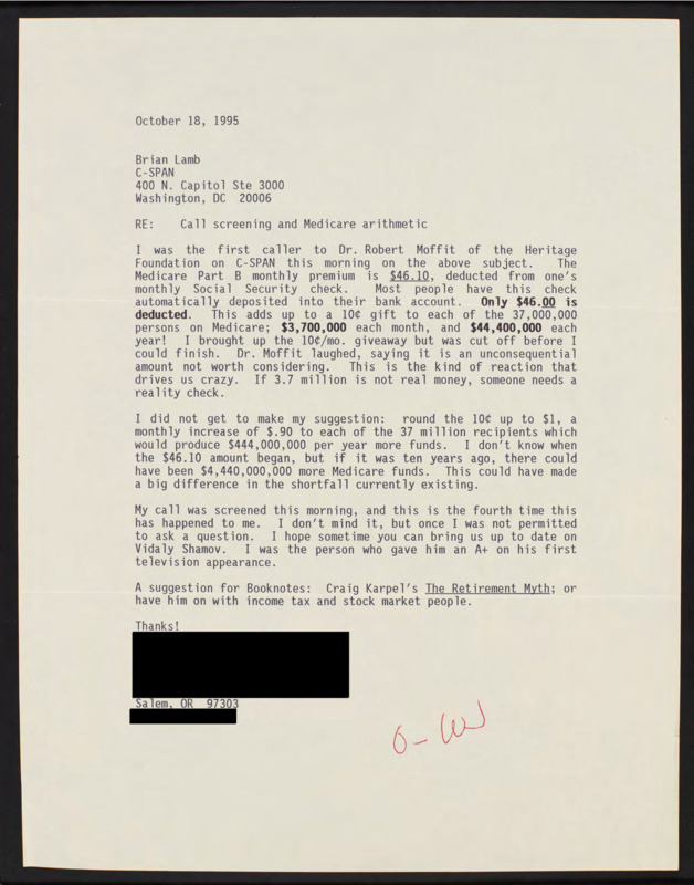 Offers information on Medicare costs and reports that they did not get to make their suggestion, then states that they believe their call was screened.