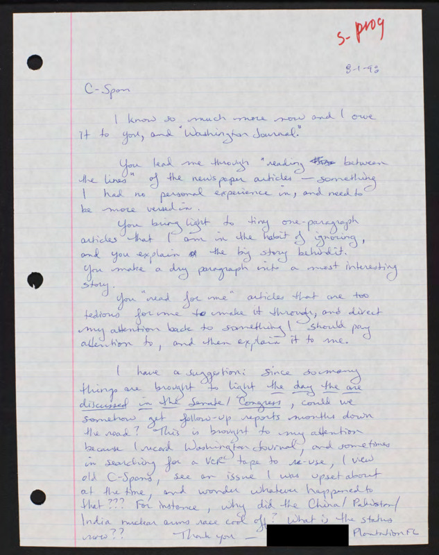 Thanks C-SPAN for helping them understand politics more and suggests following up on certain topics discussed in Congress.