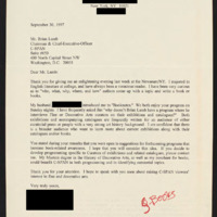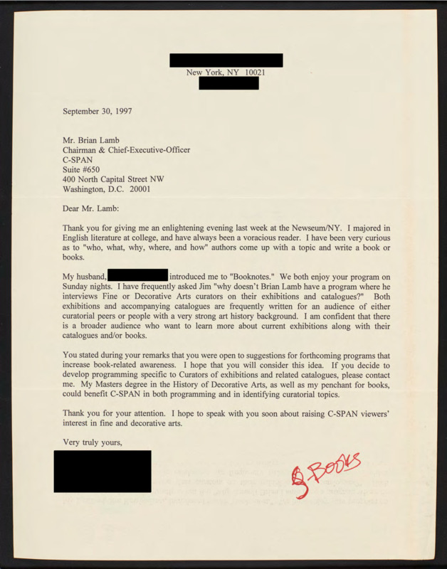 Expresses enjoyment for literature and Booknotes and suggests a program featuring curators of exhibits and decorative arts.