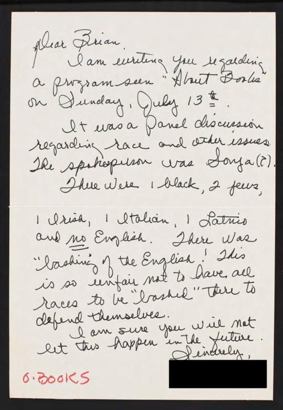 Feels that a recent program on "About Books" about race was unfair because they believe English people were "bashed."