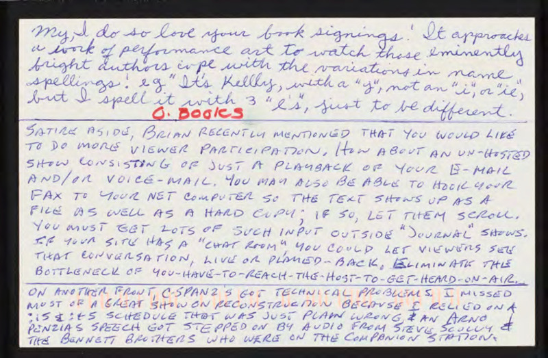 Proposes an un-hosted show just featuring viewer comments and reports technical problems on C-SPAN 2.