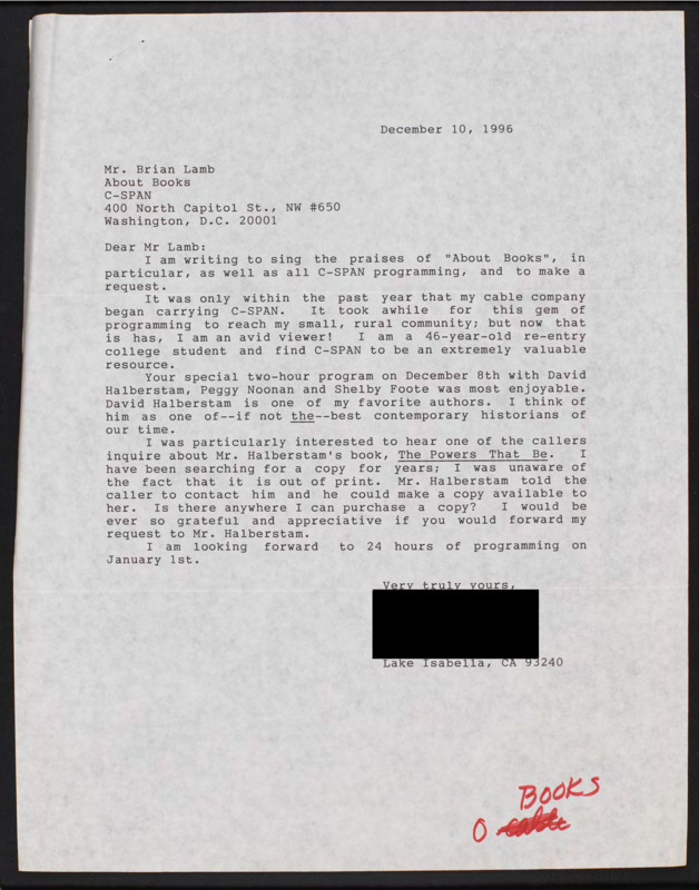 Letter to C-SPAN, 1996-12-10; 93240