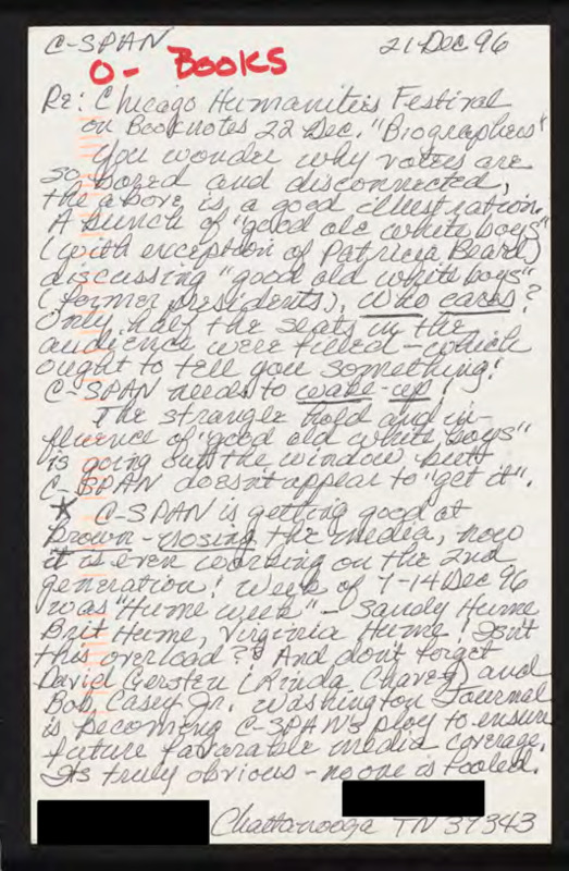 Feels that the Chicago Humanities Festival was boring and feels C-SPAN is "brown-nosing" the media.