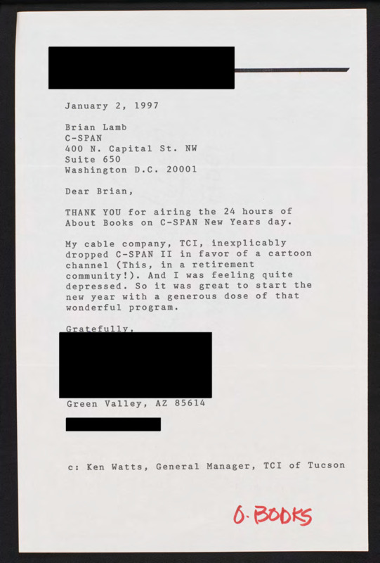 Thanks C-SPAN for "About Books" and is sad their cable company dropped C-SPAN 2.