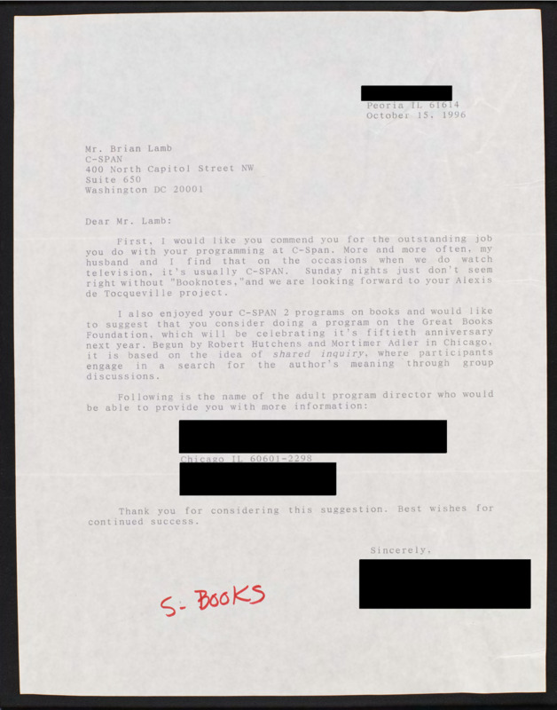 Commends C-SPAN for their programming and suggests doing a special program on the Great Books Foundation.