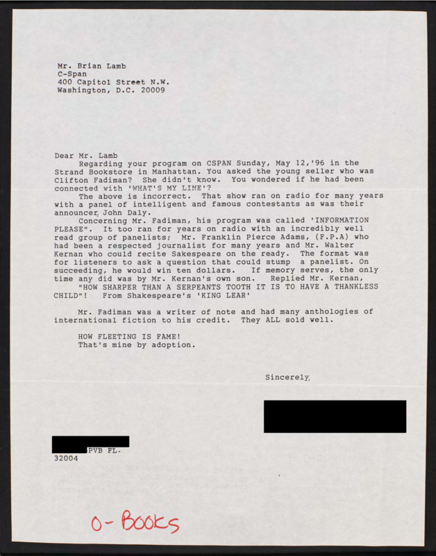 Offers clarification on a point of confusion in a recent C-SPAN book program.