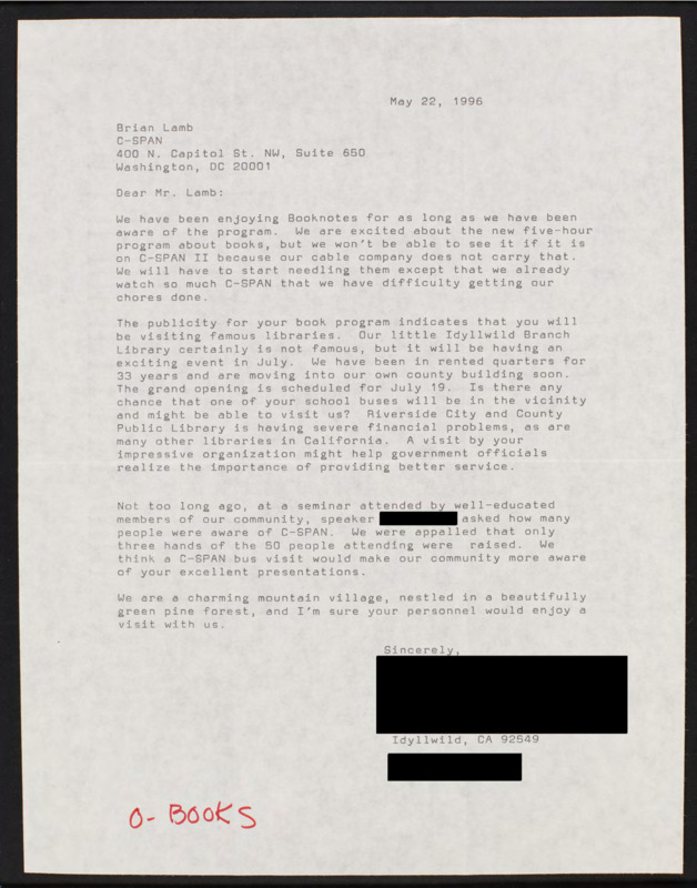 Expresses enjoyment of Booknotes but is disappointed they can't see the new program about books because they do not get C-SPAN 2, then suggests C-SPAN visit their local library.