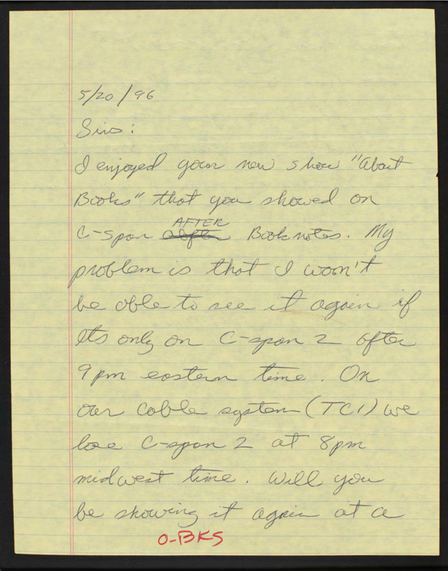 Expresses enjoyment of "About Books" but disappointment that they won't see it again if it is only on C-SPAN 2, so asks if it will be rebroadcast.