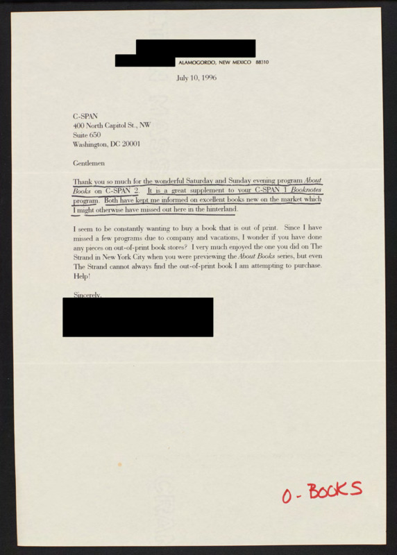 Thanks C-SPAN for "About Books" and Booknotes and asks if C-SPAN has any segments on out-of-print bookstores.