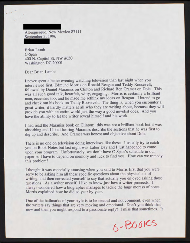 Discusses recent interviews they watched on C-SPAN and their feelings on Brian Lamb's interview style.