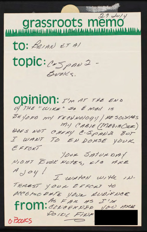 States their cable provider does not broadcast C-SPAN 2 but endorses C-SPAN's book coverage.