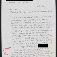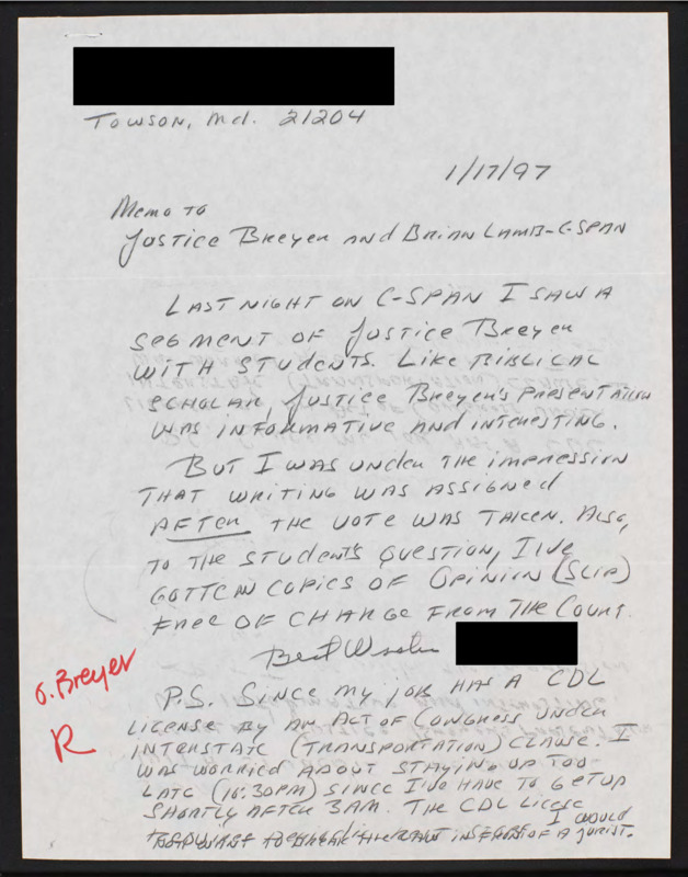 Discusses a segment where Justice Breyer was featured with students and procuring copies of decisions.