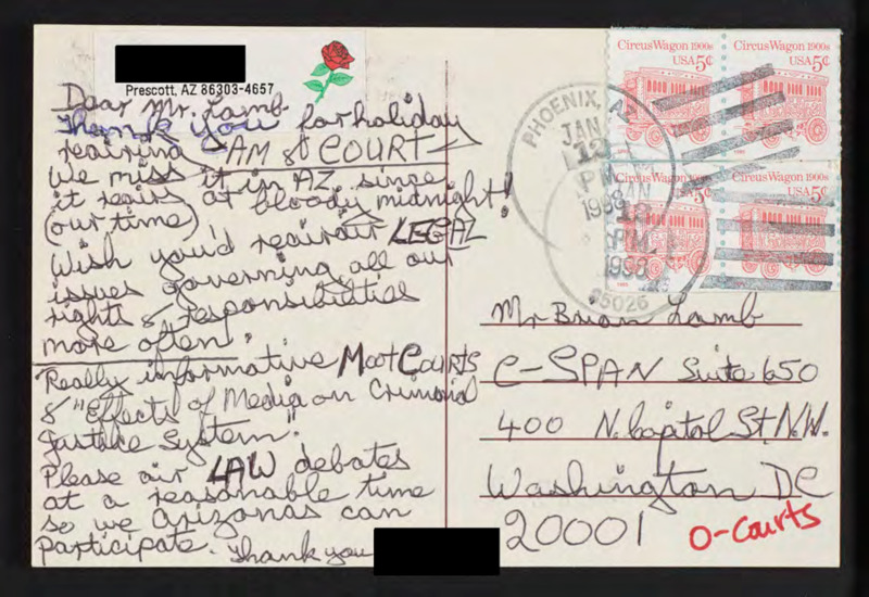 Thanks Brian Lamb for the "America and the Courts" series and wishes more legal issues would be covered.