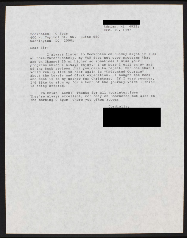 Requests a book on Lewis and Clark for the "Best of Booknotes."
