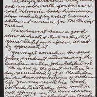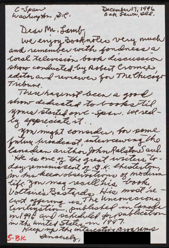 Praises Booknotes and suggests an author they'd like to see interviewed.