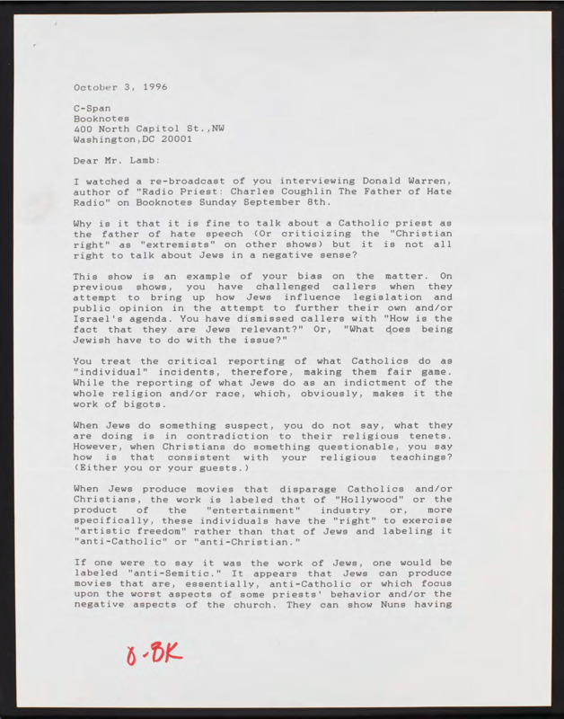 Expresses anger at the recent segment on Booknotes covering Charles Coughlin, believing it was biased and comparing it to discussion of Jewish people.