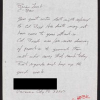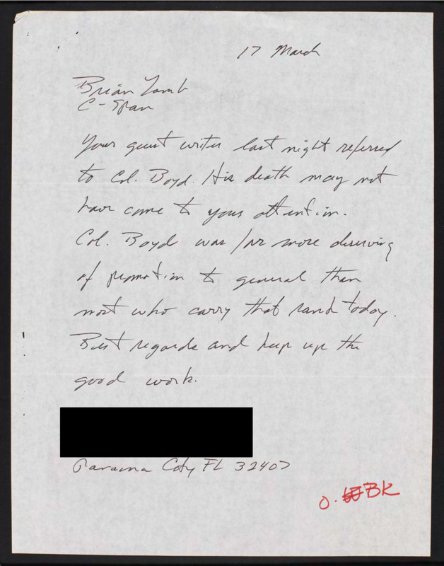 Mentions a person discussed in a Booknotes interview and informs Brian Lamb that the person recently passed away; encloses an obituary.