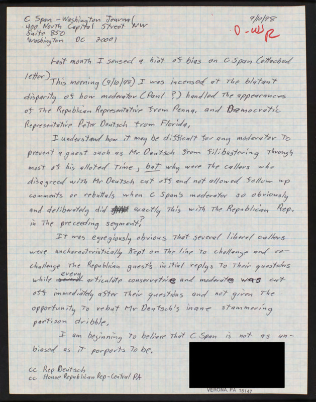 Accuses C-SPAN of bias, citing a particular incident in which Republican and Democratic representatives were treated differently; believes C-SPAn favors liberals.