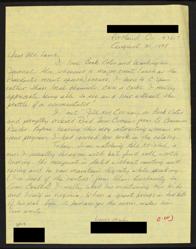 Praises Booknotes, Washington Journal, and C-SPAN programming generally and expressly compliments two particular hosts.