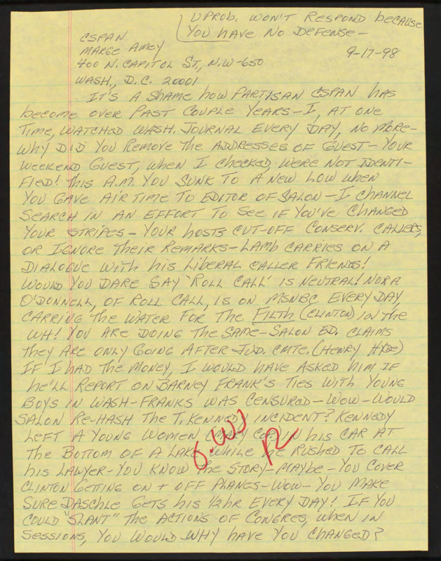 Letter to C-SPAN, 1998-09-17; 85205