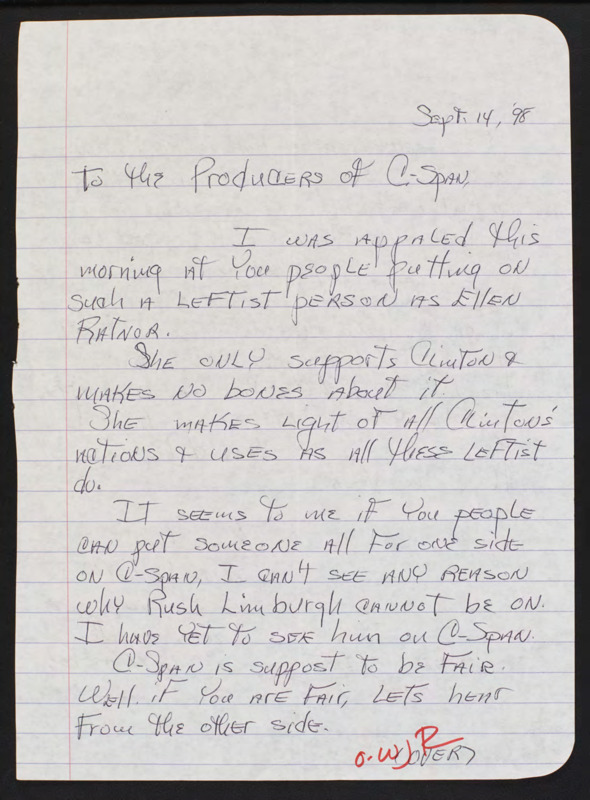 Expresses dislike of a pro-Clinton guest on C-SPAN and questions why Rush Limbaugh cannot be on the show and states the call-in system is not fair.