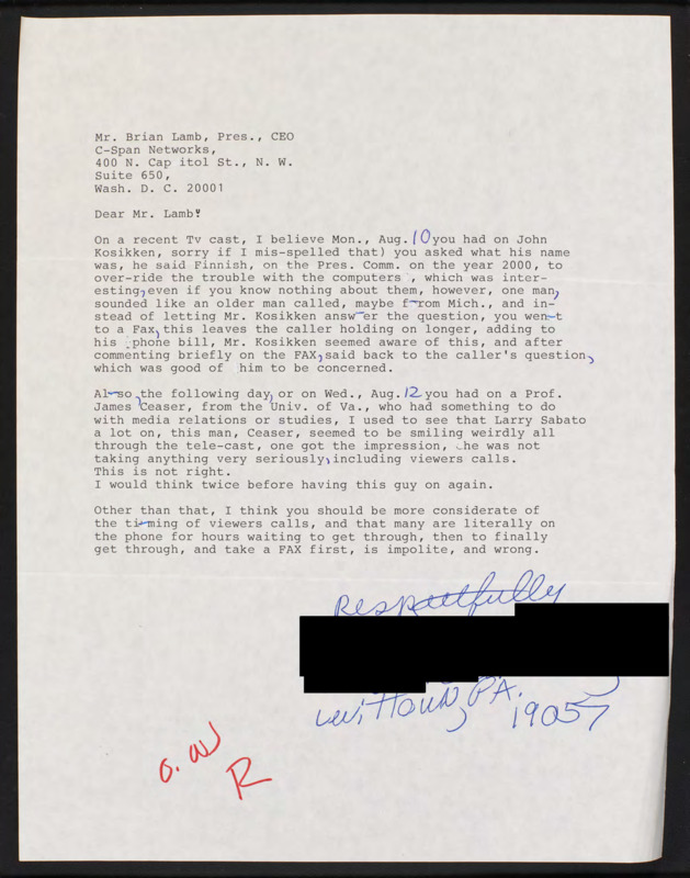 Comments on two guests featured on C-SPAN, stating that one was not concerned about callers, and suggests phone calls be taken before faxes.