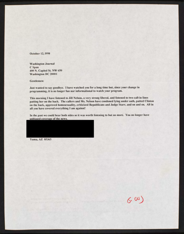 Accuses C-SPAN of bias toward liberals and states they will no longer watch C-SPAN if they cannot get two viewpoints.