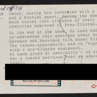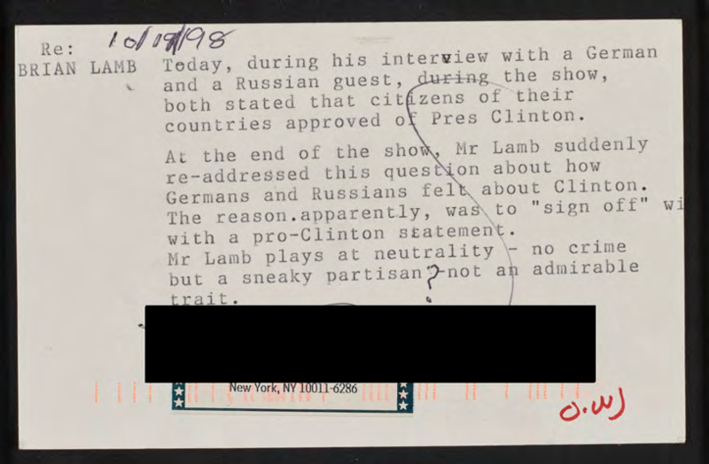 Questions Brian Lamb's impartiality based upon his questions to a German and a Russian guest about their support of Clinton.