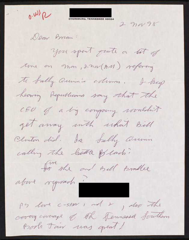 Criticizes a commentator for her views on Bill Clinton's impeachment and questions the integrity two journalists.