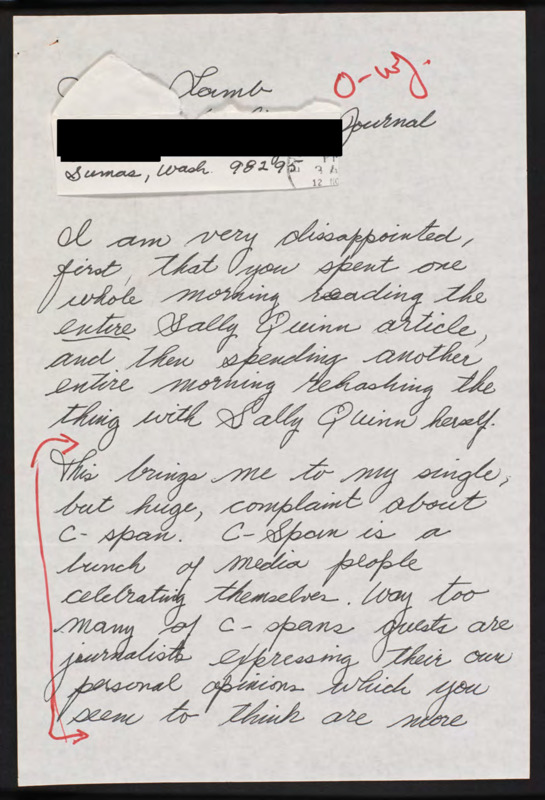 Complains that C-SPAN is a vehicle for self-congratulating media personalities, criticizes a particular journalist, and takes issue with the criticisms against Bill Clinton.